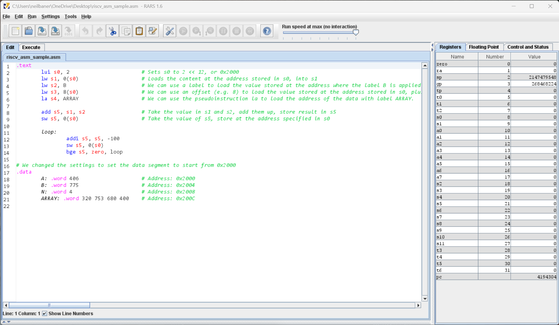 From the RARS home screen, click File -> Open, and browse to the location where you have downloaded riscv_asm_sample.asm